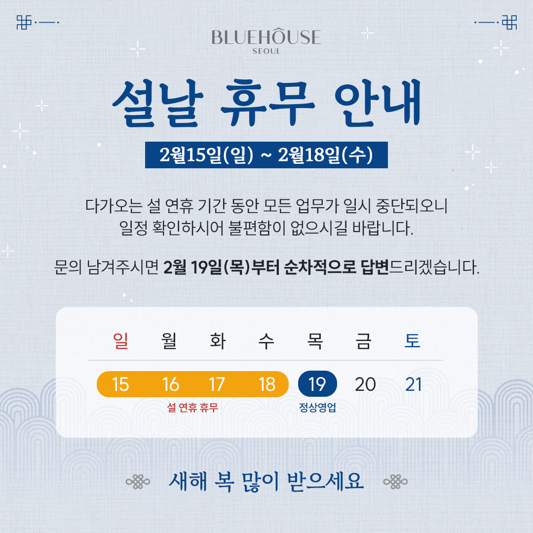 블루하우스서울(이하 ‘회사’라 한다)는 개인정보 보호법 제30조에 따라 정보 주체의 개인정보를 보호하고 이와 관련한 고충을 신속하고 원활하게 처리할 수 있도록 하기 위하여 다음과 같이 개인정보 처리지침을 수립, 공개합니다.